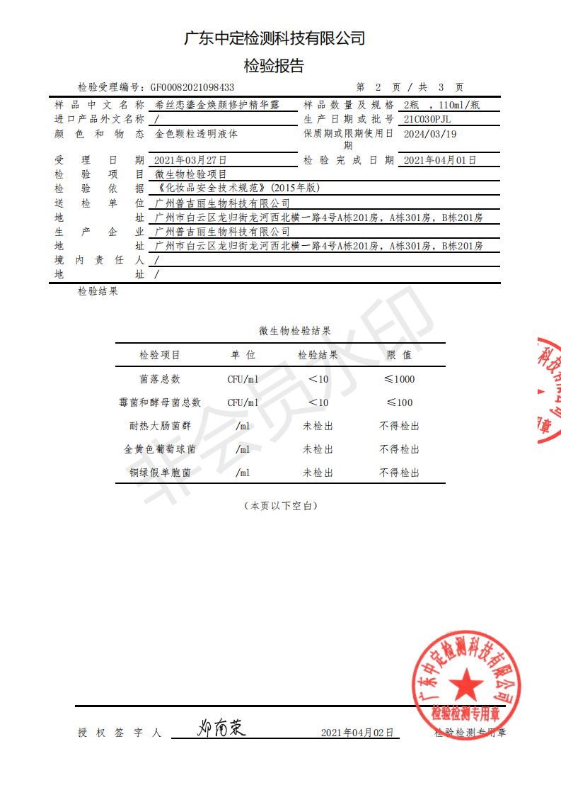 希丝恋-鎏金焕颜修护精华露(检测报告)
