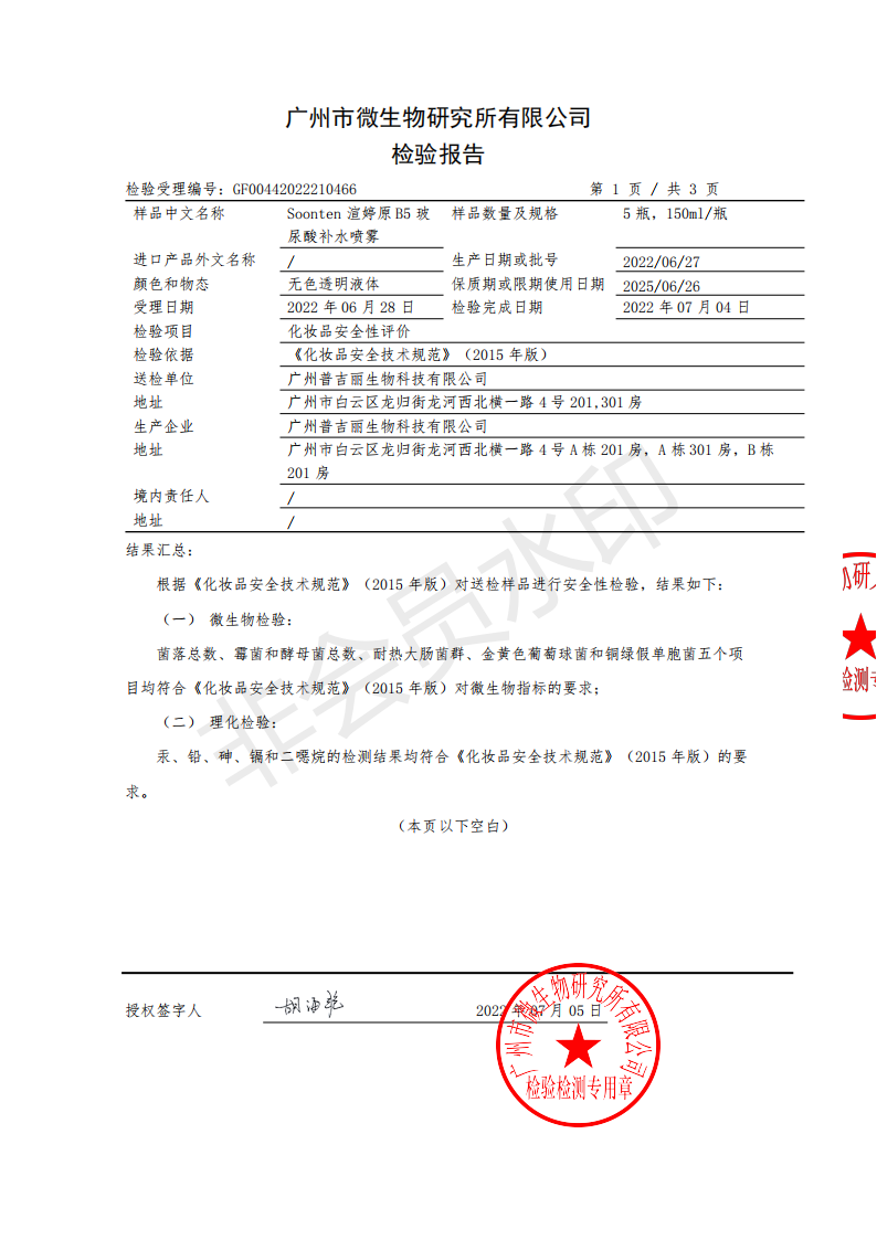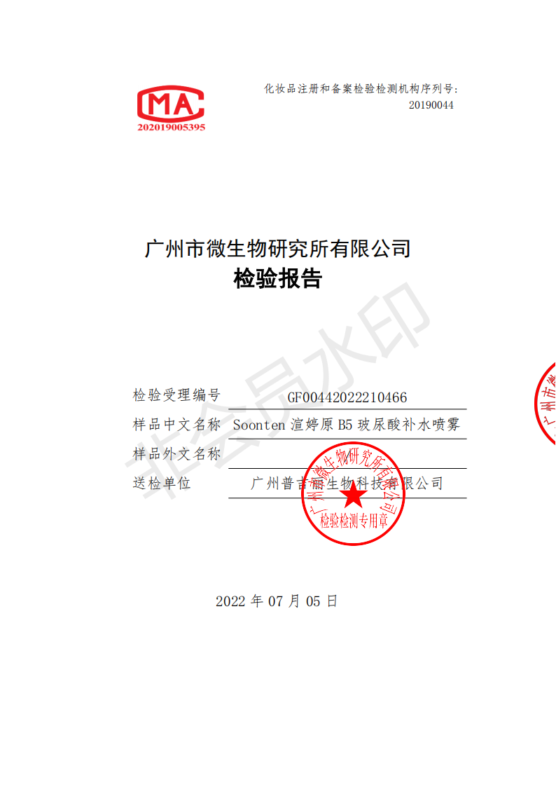 渲婷-原B5玻尿酸补水喷雾(检测报告)