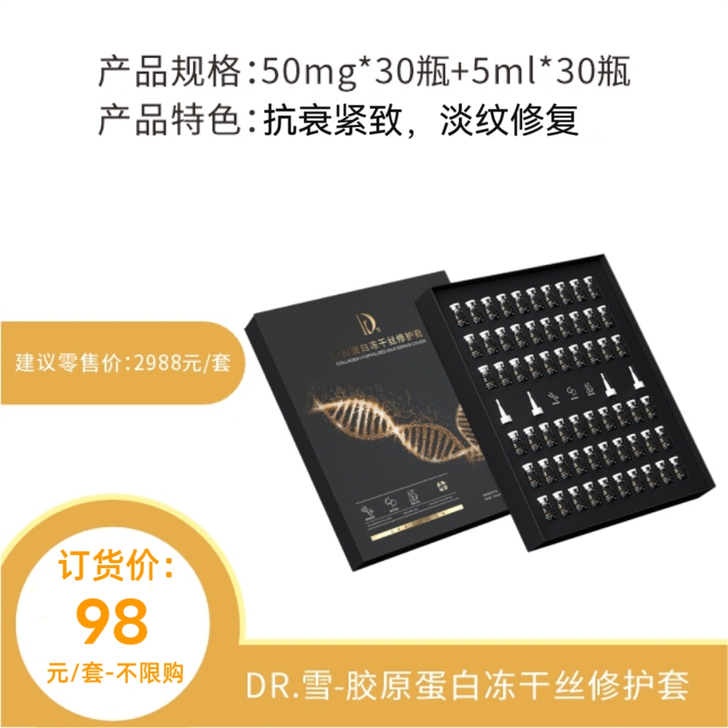 限时秒杀 ¥ ¥ 距离结束还有 推荐 【1套】DR.雪-胶原蛋白冻干丝修护套 ¥98.00 不含税 ¥2988.00 库存:995 规格 请选择 产品规格 购买数量 ... 商品详情 用户评论 暂无评论 库存:00 请选择: 产品规格 × 规格选择 1套 购买数量 - + 加入购物车 立即购买 首页 购物车 收藏 加入购物车 立即购买