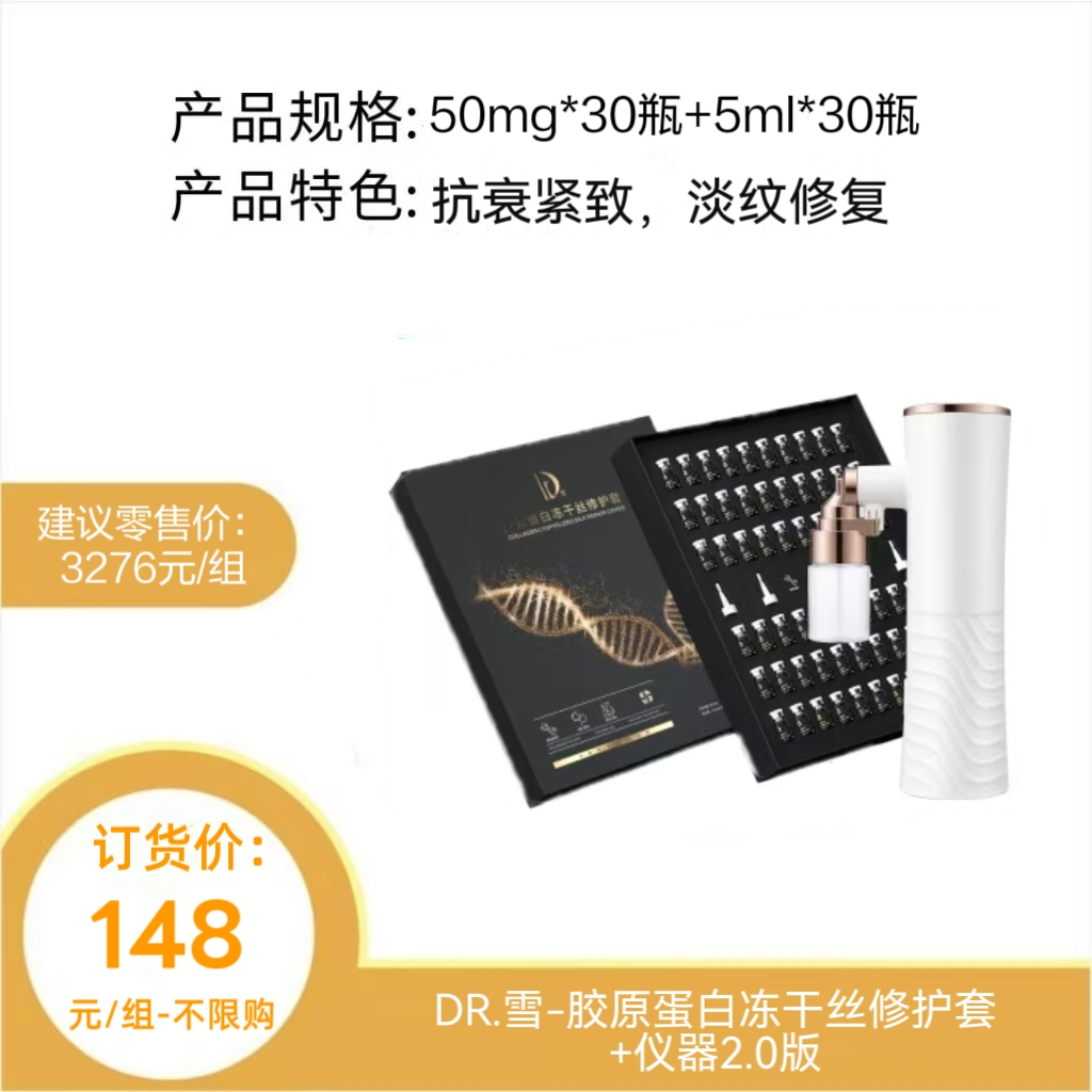 限时秒杀 ¥ ¥ 距离结束还有 推荐 【1组】DR.雪-胶原蛋白冻干丝修护套+仪器2.0版 ¥148.00 不含税 ¥3276.00 库存:986 规格 请选择 产品规格 购买数量 ... 商品详情 用户评论 暂无评论 库存:00 请选择: 产品规格 × 规格选择 1组 购买数量 - + 加入购物车 立即购买 首页 购物车 收藏 加入购物车 立即购买